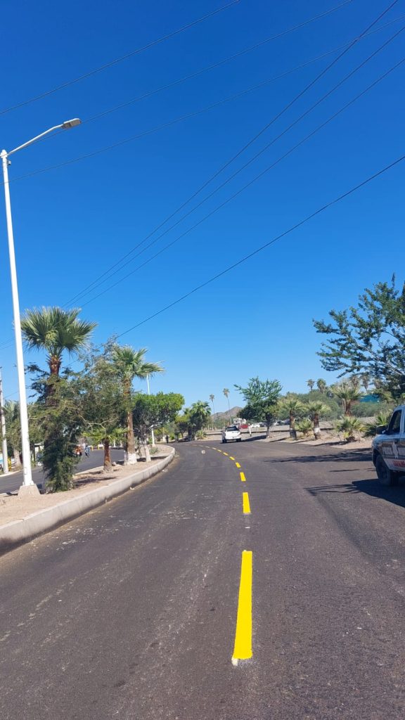 Empalme, Sonora.- El alcalde Luis Fuentes Aguilar constató los significativos avances en los trabajos de rehabilitación del bulevar ‘Hilario Sánchez Rubio’, en la colonia Bellavista, en donde se aplicó riego de sello, calafateo e inició el balizamiento desde carretera internacional número 15 hasta avenida Reforma.