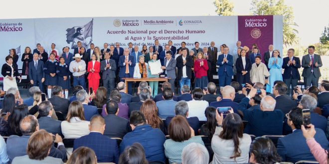 Ciudad de México; 25 de noviembre de 2024.- Con la firma del Acuerdo Nacional por el Derecho Humano al Agua y la Sustentabilidad promovido por la presidenta Claudia Sheinbaum Pardo y asumido por gobernadores emanados de todos los partidos, empresarios, instituciones académicas y distritos de riego, se establecen acciones concretas para garantizar el suministro del vital líquido en beneficio de las y los sonorenses, aseveró el gobernador Alfonso Durazo Montaño.