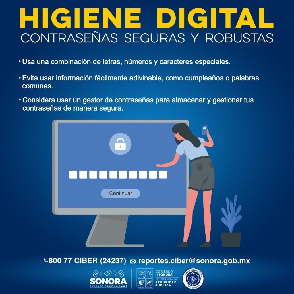 Hermosillo, Sonora; 8 de enero de 2025.- Para prevenir que las y los sonorenses sean víctimas de delitos cibernéticos como el robo de contraseñas, la Secretaría de Seguridad Pública (SSP) compartió una serie de recomendaciones y buenas prácticas que son indispensables para mantener una correcta higiene digital.