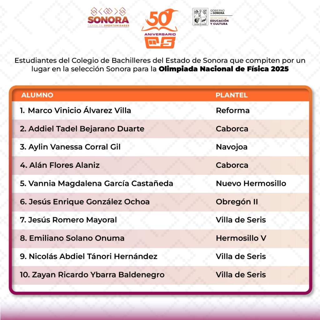 Asimismo, mencionó que también están en la preselección los alumnos Emiliano Solano Onuma, del plantel Hermosillo V; Addiel Tadel Bejarano Duarte y Alán Flores Alaniz, ambos del plantel Caborca; Aylin Vanessa Corral Gil, del plantel Navojoa; y Jesús Enrique González Ochoa, del plantel Obregón II.
