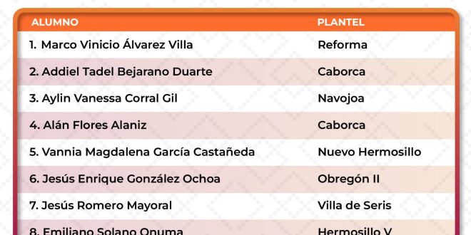 El director general de Cobach, Rodrigo Arturo Rosas Burgos, informó que los alumnos del Colegio de Bachilleres son: Jesús Romero Mayoral, Nicolás Abdiel Tánori Hernández y Zayán Ricardo Ybarra Baldenegro, del plantel Villa de Seris; Marco Vinicio Álvarez Villa, del plantel Jesús Guillermo Careaga Cruz (Reforma); y Vannia Magdalena García Castañeda, del plantel Nuevo Hermosillo.
