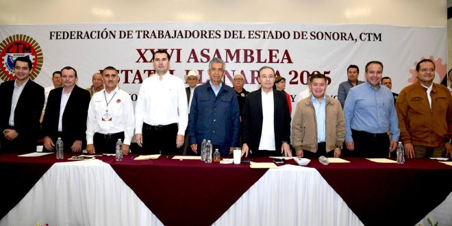 Hermosillo, Sonora; 27 de noviembre de 2025.- Las políticas y reformas impulsadas por los gobiernos de la Cuarta Transformación han logrado una notable mejora en las condiciones salariales y laborales de millones de trabajadores en el país, afirmó el gobernador Alfonso Durazo Montaño durante la asamblea estatal plenaria de la CTM, resultados que también fueron reconocidos por los líderes sindicales.