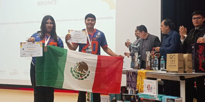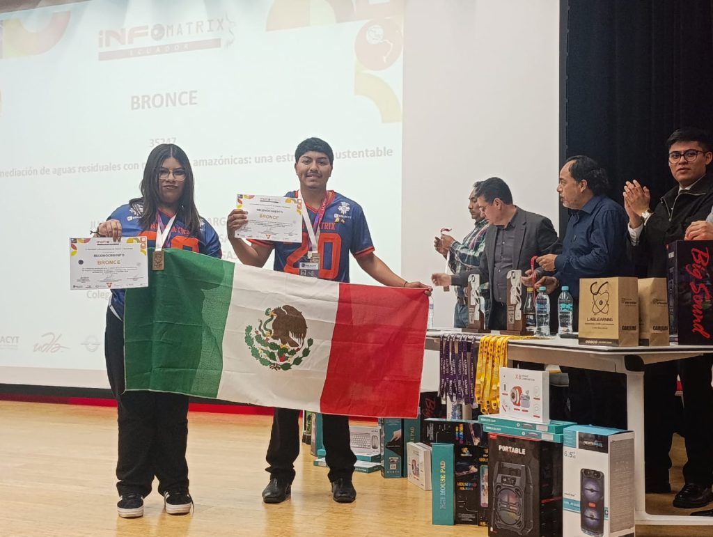 Hermosillo, Sonora; 7 de marzo de 2026.- Samantha Arreola Torres y Sergio Felipe Lagunas Coria, estudiantes del Colegio de Estudios Científicos y Tecnológicos del Estado de Sonora (Cecyte), plantel Esqueda, ganaron medalla de bronce en el concurso Infomatrix Sudamérica Ecuador 2026, destacó el titular de la Secretaría de Educación y Cultura (SEC).