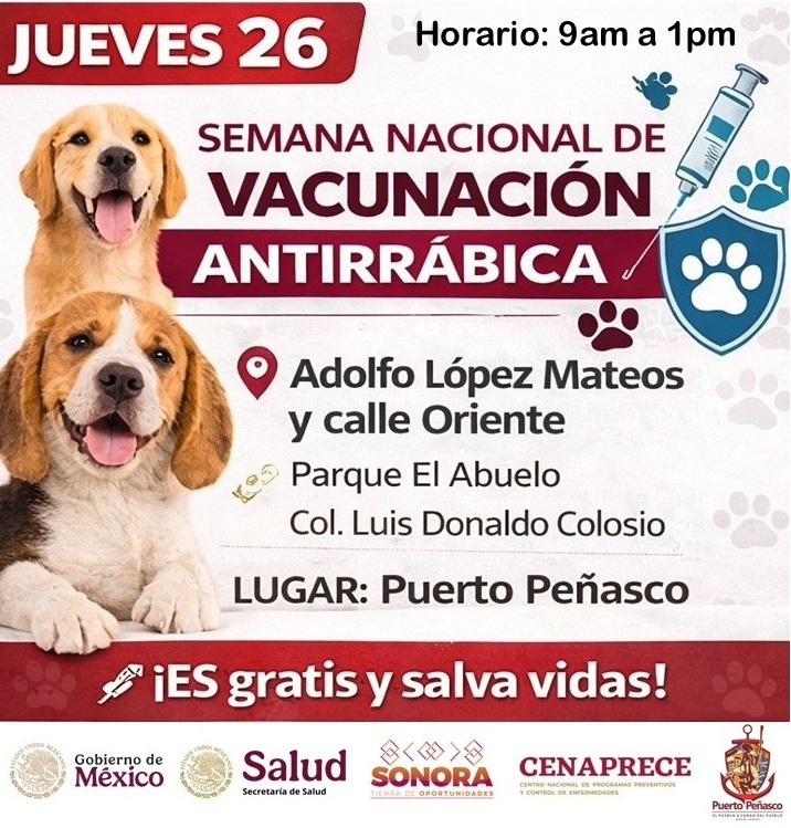 Hermosillo, Sonora; 24 de marzo del 2026.– El Gobierno de Sonora, a través de la Secretaría de Salud Pública (SSP), invita a la población a participar en la Semana Nacional de Vacunación Antirrábica, una estrategia fundamental para proteger la salud de las mascotas y prevenir enfermedades que pueden afectar a las familias.