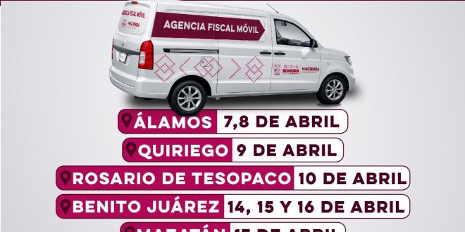 Hermosillo, Sonora; 6 de abril de 2026.- El Gobierno de Sonora, a través de la Dirección General de Recaudación de la Secretaría de Hacienda, informa a los contribuyentes que la agencia fiscal móvil estará presente en los municipios del sur del estado con el fin de acercar los servicios a los contribuyentes.