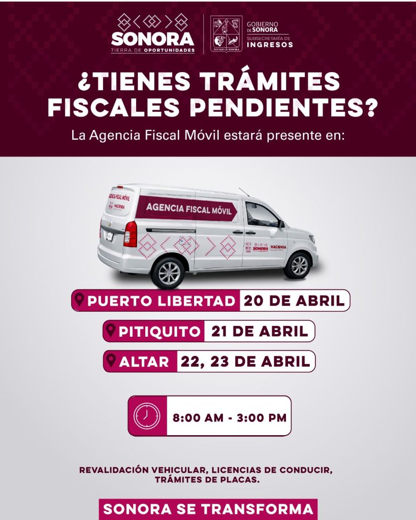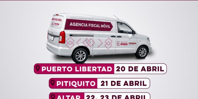 Los municipios que visitará la agencia fiscal móvil son: Puerto Libertad el lunes 20 de abril, Pitiquito martes 21, concluyendo en Altar los días 22 y 23, en un horario de atención de 8:00 a 15:00 horas, ubicados en el Palacio Municipal de los municipios anteriormente mencionados.