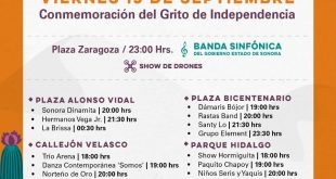 Hermosillo, Sonora; 14 de septiembre de 2023.- La noche de este viernes 15 de septiembre en las inmediaciones de Palacio de Gobierno, se llevará a cabo la ceremonia conmemorativa al 213 aniversario del Grito de Independencia, encabezado por el gobernador Alfonso Durazo Montaño, acompañado de una serie de eventos cívicos …