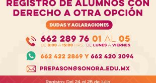 Hermosillo, Sonora; 25 de julio de 2023.- Del 24 al 28 de julio se lleva a cabo el registro de solicitudes de asignación de espacios para jóvenes con derecho a otra opción (CDO) a través del portal https://prepason.sonora.edu.mx, como parte de la convocatoria PrepaSon 2023, anunció el Gobierno de Sonora. …