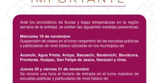 Hermosillo, Sonora; 19 de noviembre 2025.- La Secretaría de Educación y Cultura (SEC) informa que se suspenden clases en el turno vespertino de las escuelas públicas y particulares de nivel básico ubicadas en los municipios de Aconchi, Agua Prieta, Arizpe, Bacoachi, Banámichi, Baviácora, Fronteras, Huépac, San Felipe de Jesús, Nacozari …